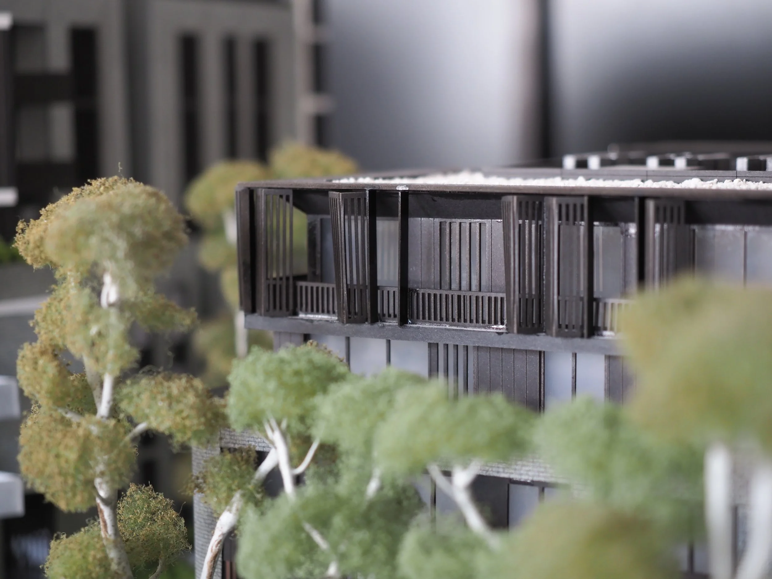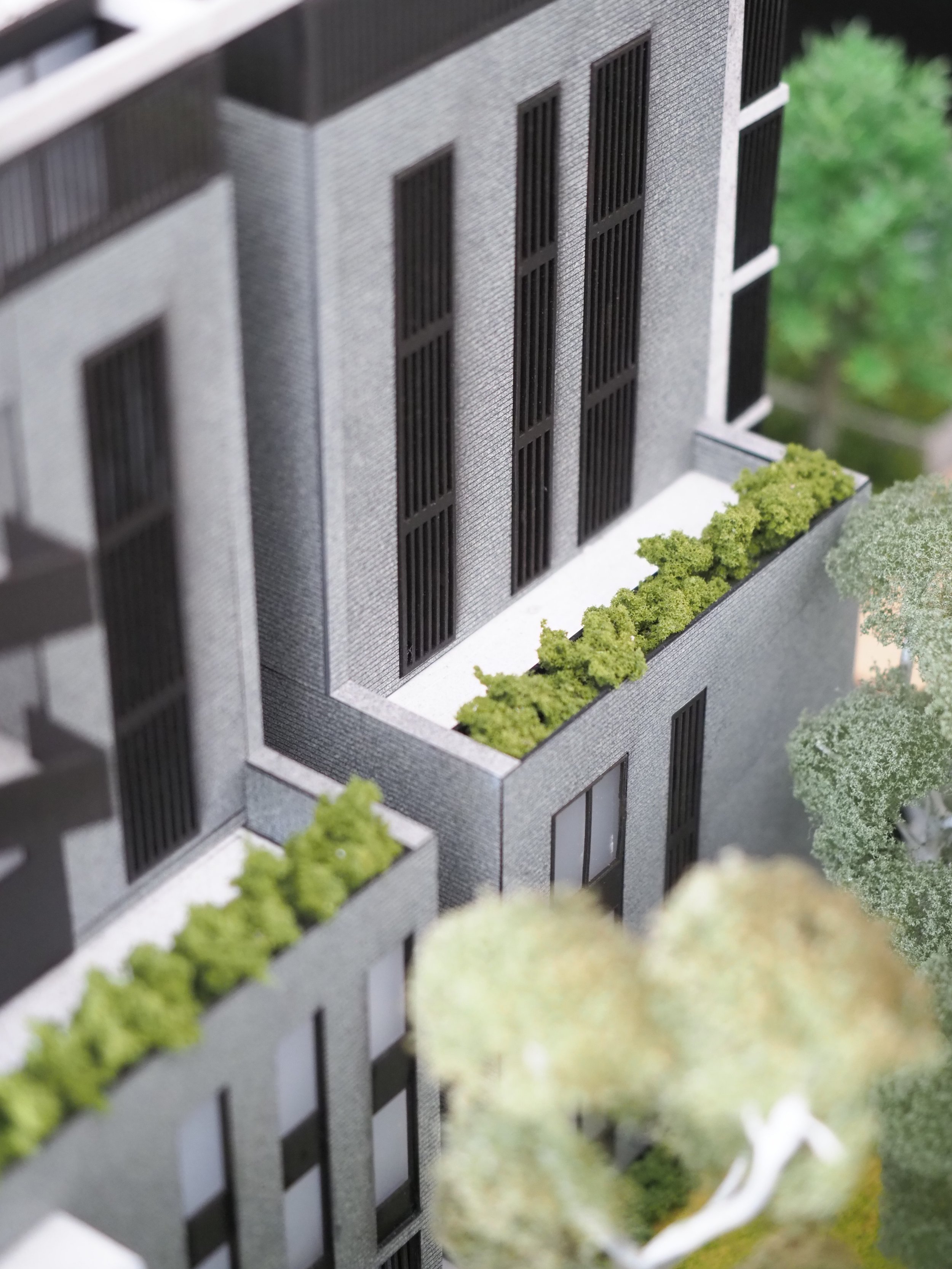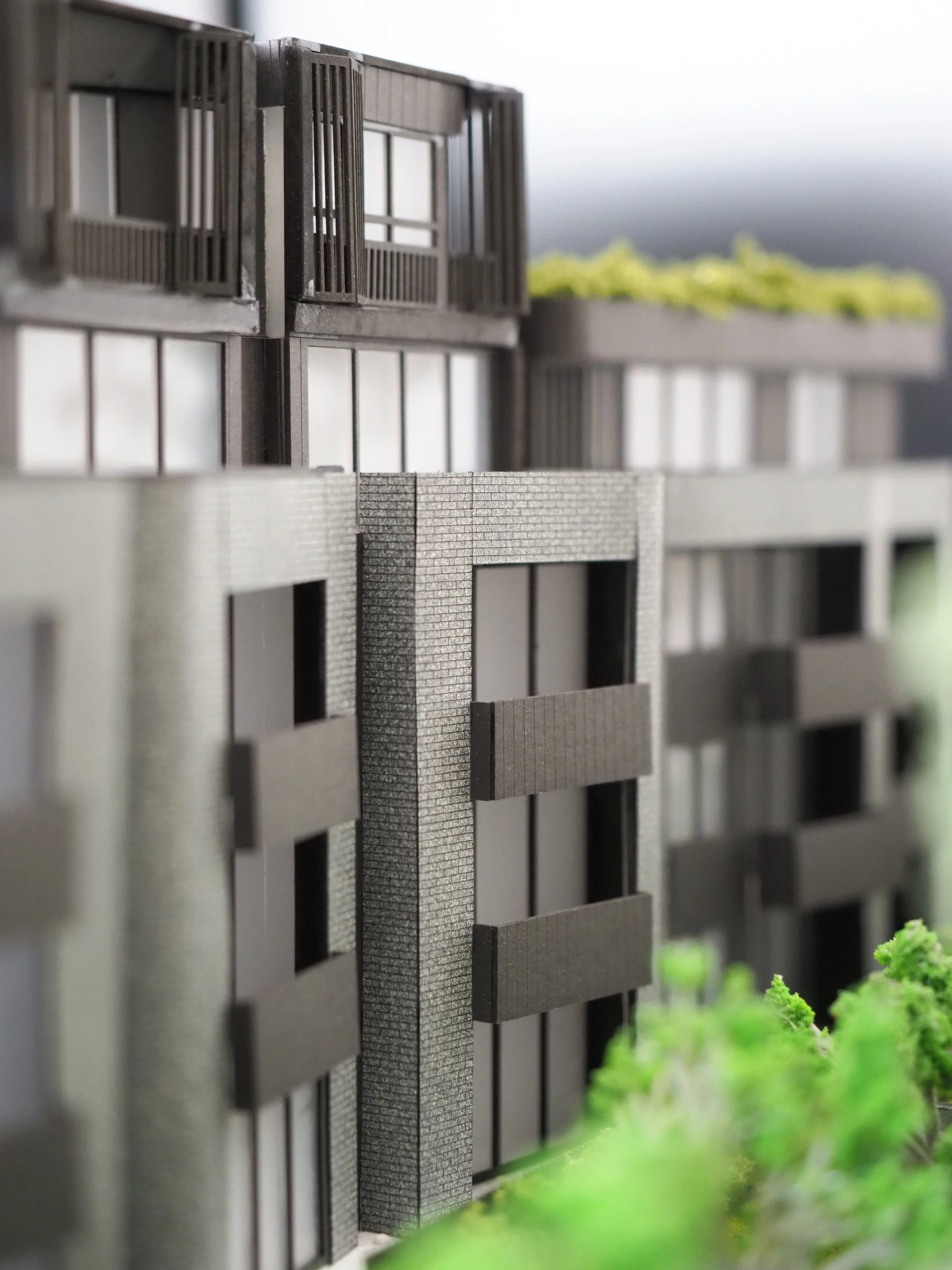 The intricacies of the model lie in the detail on the brickwork which was executed through precise laser-engravings and the vertically detailed bi-fold sunshades on the exterior. Furthermore, the distinctly rounded form of the low rise residential flats softens and complements the sharp features of its adjacent high rise buildings which make this development standout among the rest.