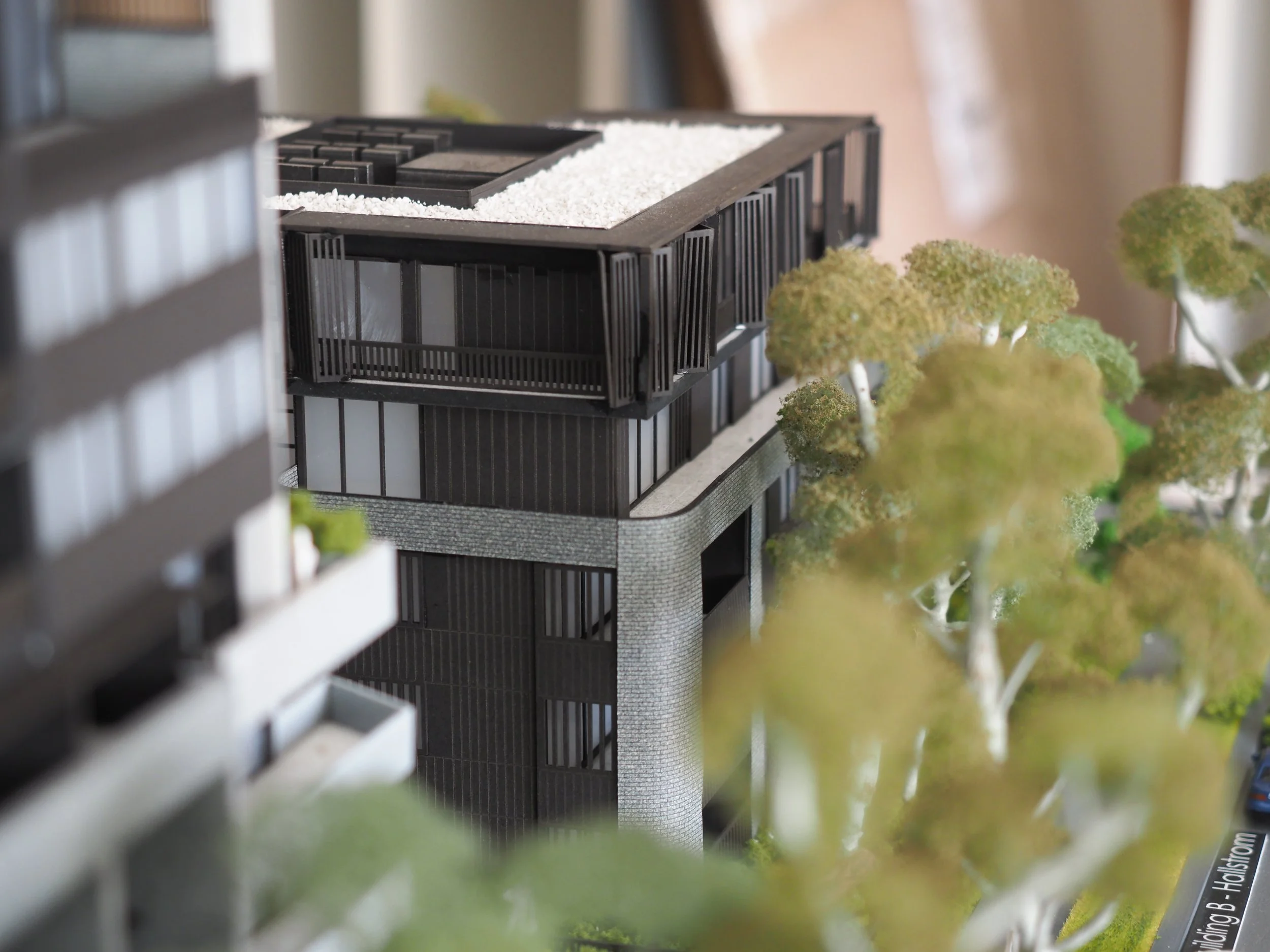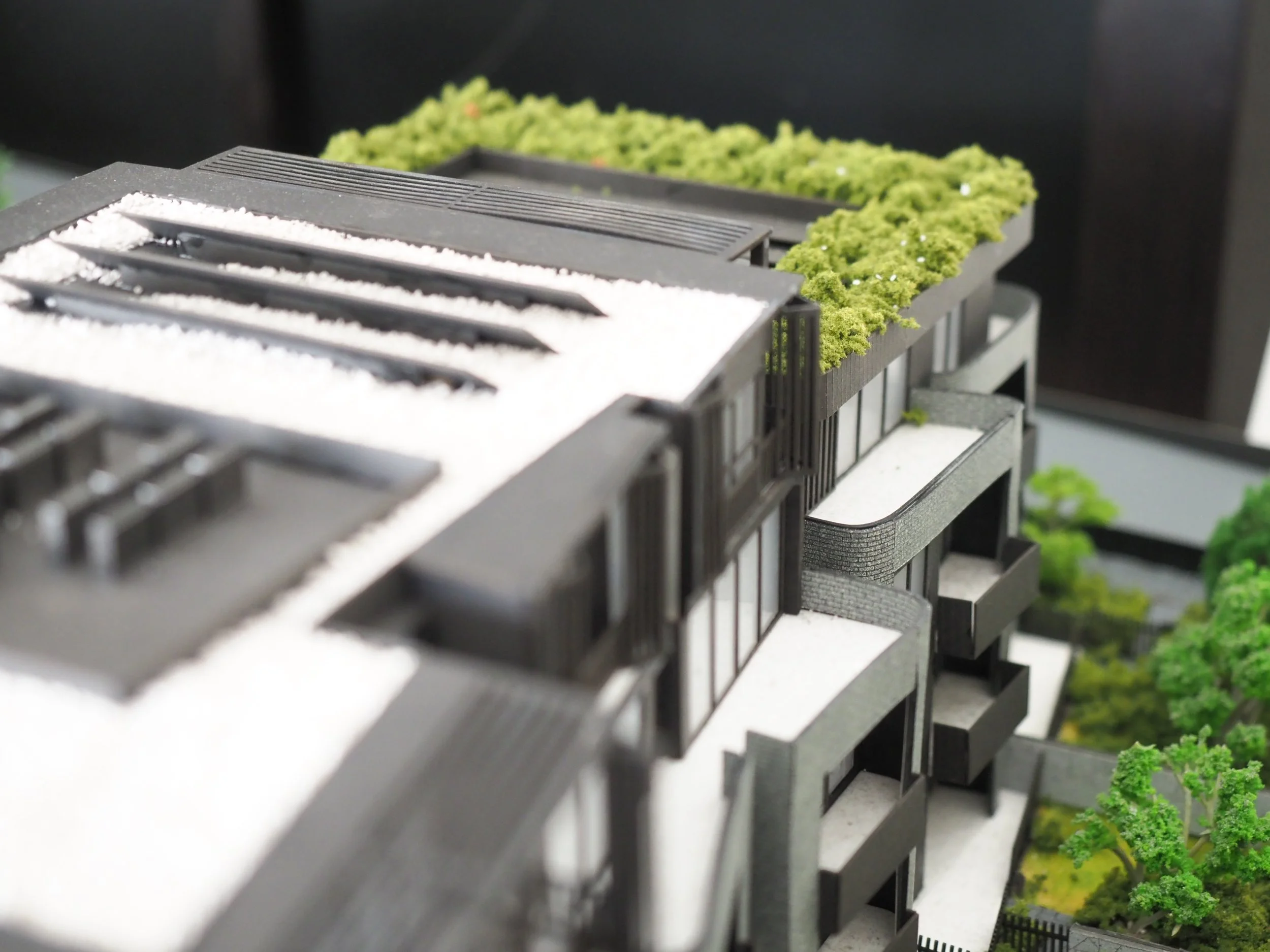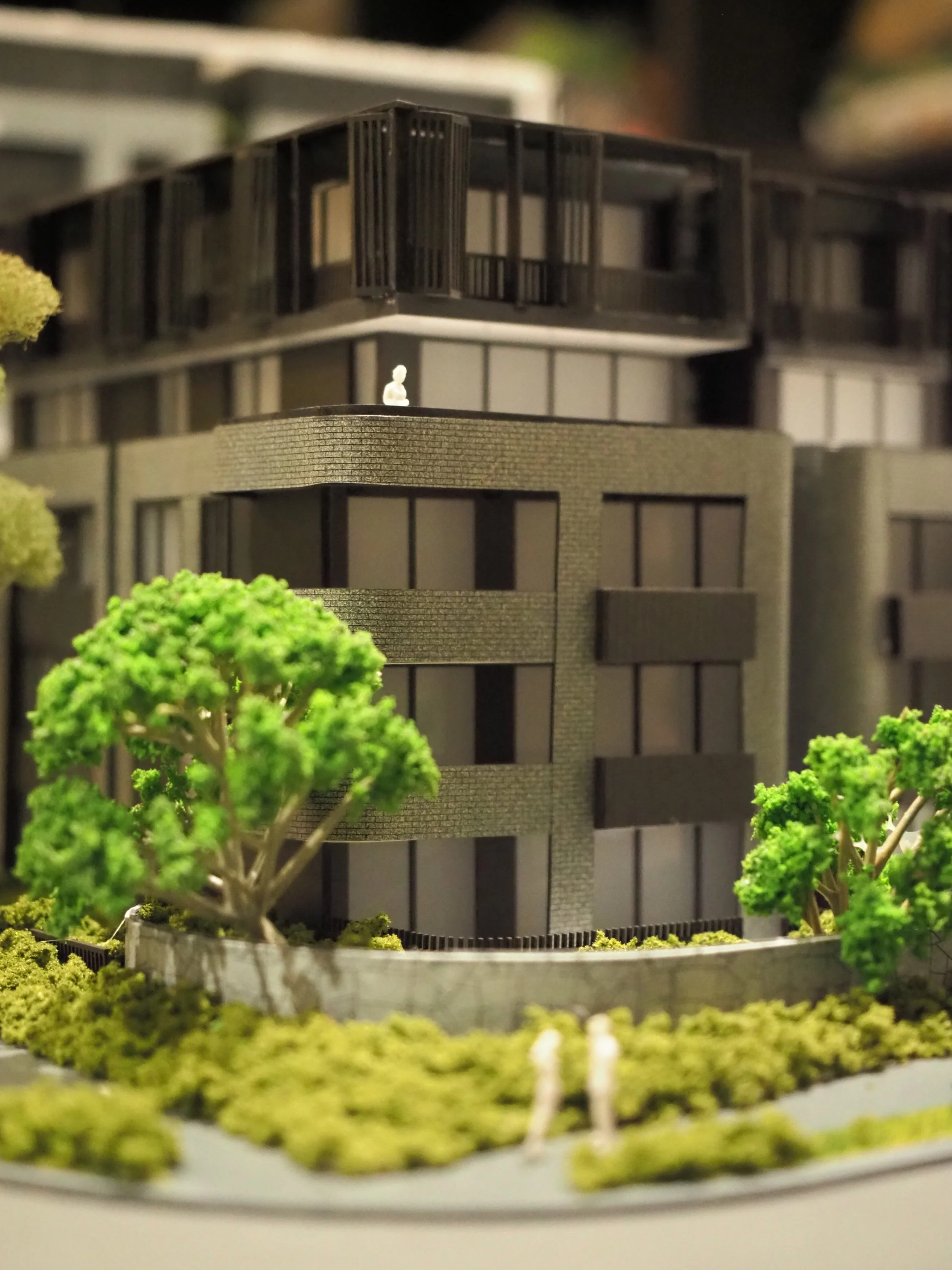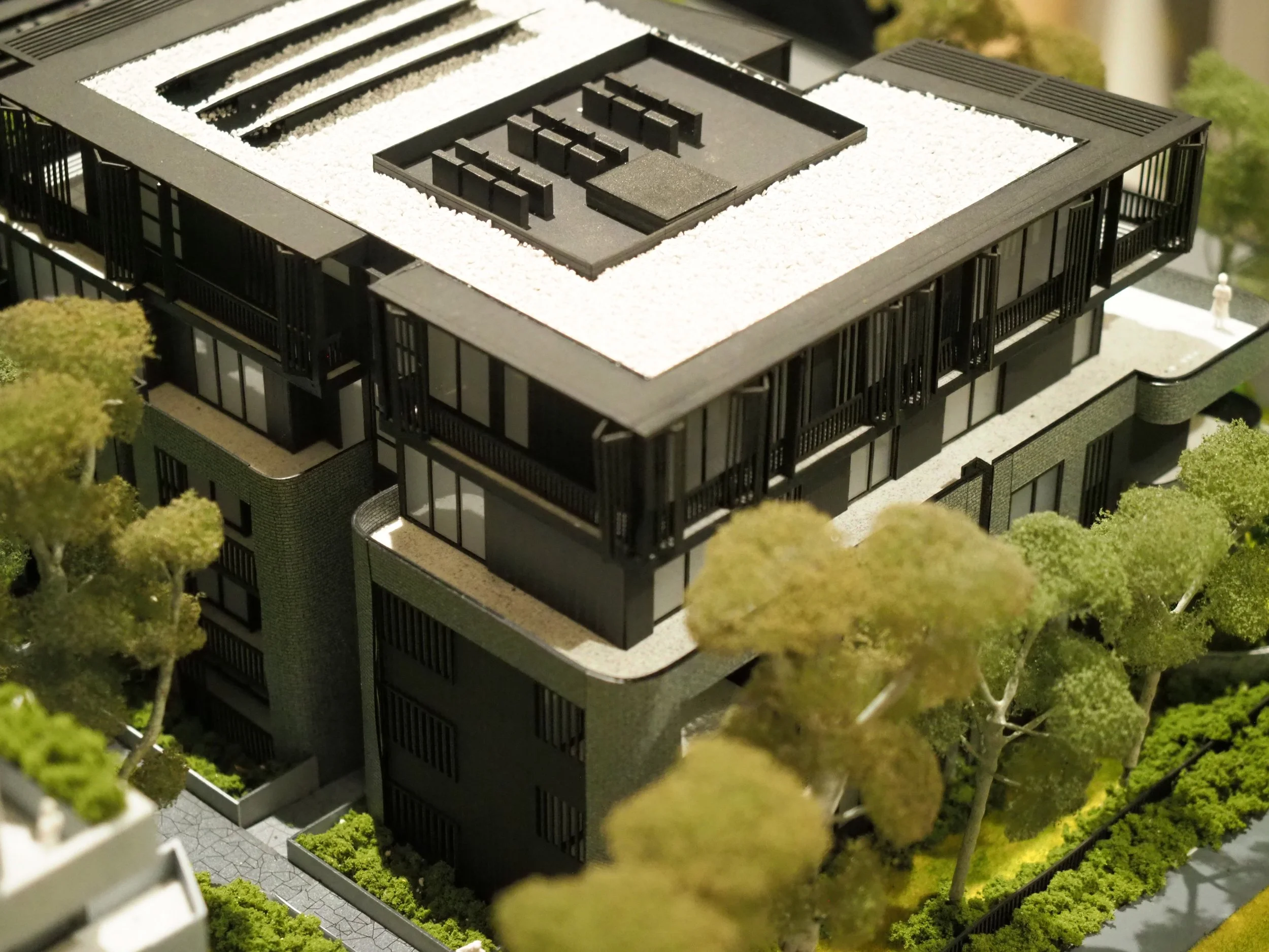 The intricacies of the model lie in the detail on the brickwork which was executed through precise laser-engravings and the vertically detailed bi-fold sunshades on the exterior. Furthermore, the distinctly rounded form of the low rise residential flats softens and complements the sharp features of its adjacent high rise buildings which make this development standout among the rest.